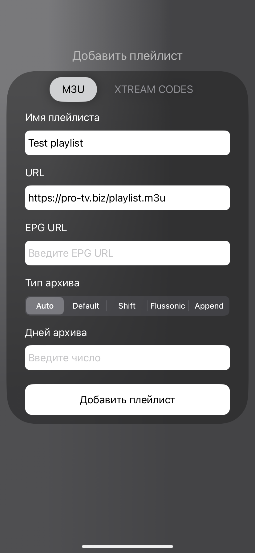 - Укажите во всплывающем окне «Добавить плейлист» любое имя плейлиста и URL (ссылку на плейлист). При желании внесите также EPG URL (ссылку на программу телепередач), установите тип архива и количество дней, затем нажмите на кнопку «Добавить плейлист»: