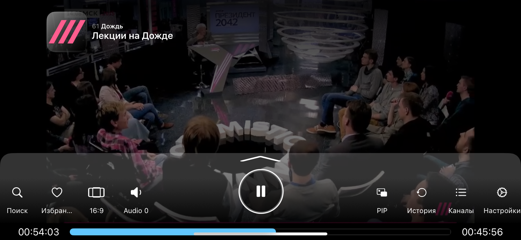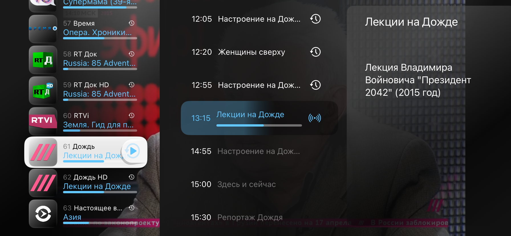 - Коснитесь любой части экрана для отображения всплывающего меню плеера, затем нажмите на иконку «Каналы», чтобы увидеть список телеканалов, доступных в вашем плейлисте: