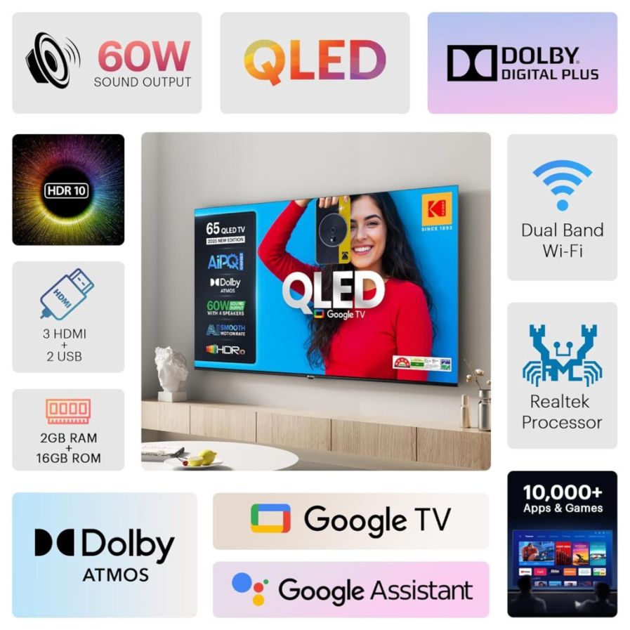 Главная звезда серии — 65-дюймовый телевизор. Он работает на процессоре AiPQ с графикой Mali-G52, умеет сглаживать движение с помощью AI Smooth Motion и предлагает набор режимов, которые пытаются угодить каждому вкусу. Чтобы хозяин не искал внешние колонки, модель получила акустику мощностью 60 Вт. У остальных трёх вариантов звук чуть скромнее — по 50 Вт, но всё ещё достаточно громкий для вечернего кино.